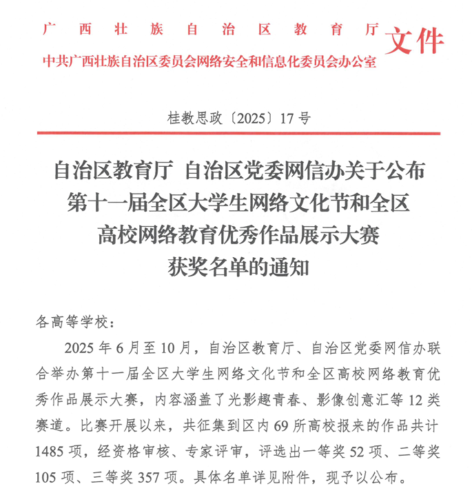 近日,自治区教育厅与党委网信办公布第十一届全区大学生网络文化节和网络教育优秀作品展示活动获奖名单。我院党委高度重视此次赛事,在光影趣青春、优秀微课、优秀新媒体作品3个赛道的征集中,聊斋艳谭