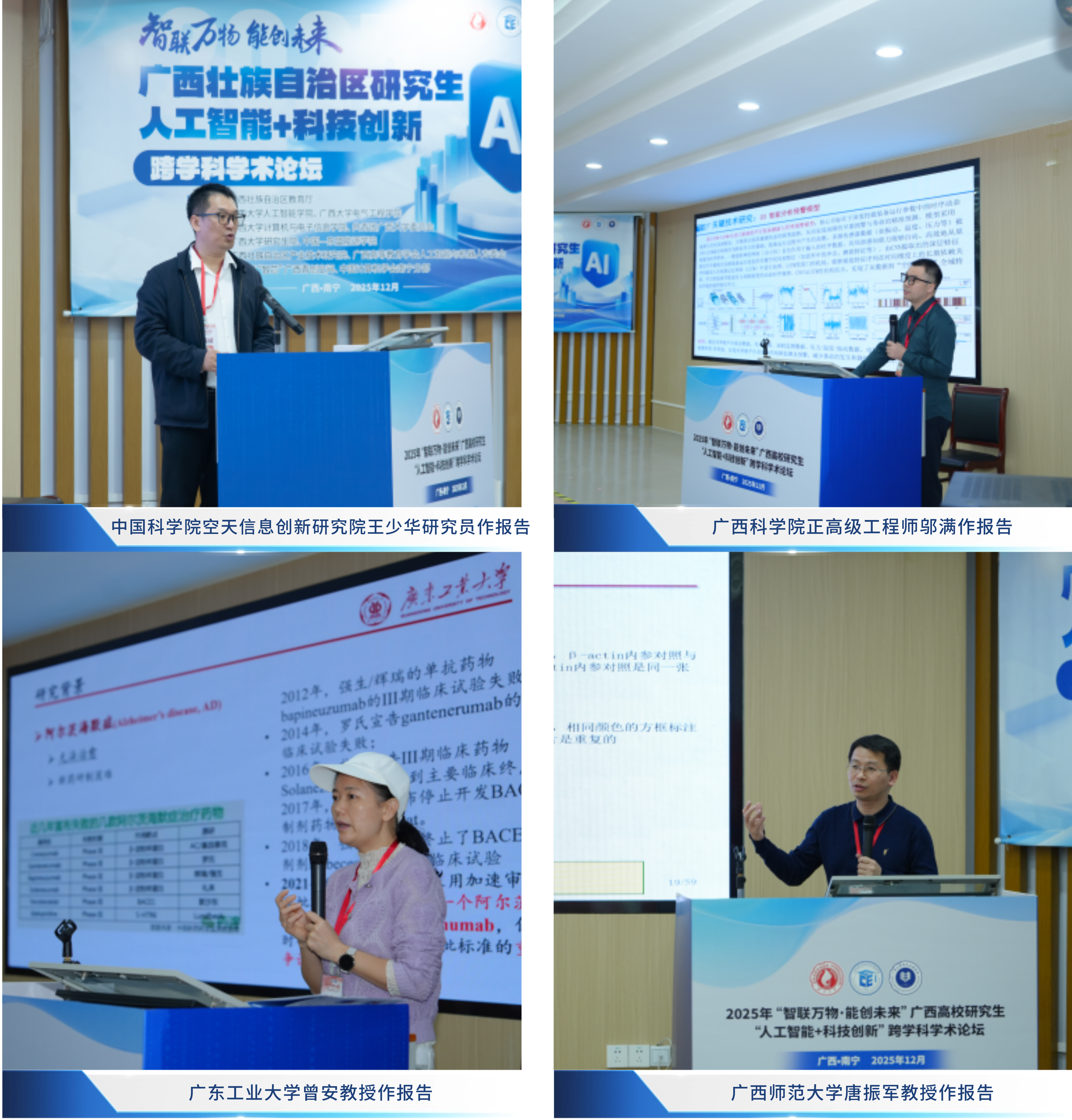 本次论坛的一大亮点是邀请了多位区内外知名专家学者分享前沿洞察。中国科学院空天信息创新研究院王少华研究员、广东工业大学计算机学院曾安教授分别就“高智能空间计算”和“阿尔茨海默症智能诊断”作了精彩的主旨报告,带来了国家级科研机构的先进理念与技术视野。区内专家代表,广西科学院邬满正高级工程师、广西师范大学唐振军教授也分别结合“北部湾海洋牧场智慧管控”和“图像哈希技术”等本土化应用场景,分享了扎实的研究进展与实践经验。专家们的报告高屋建瓴又紧贴实际,极大地拓宽了师生们的学术视野,为研究生们的科研方向提供了宝贵指导。