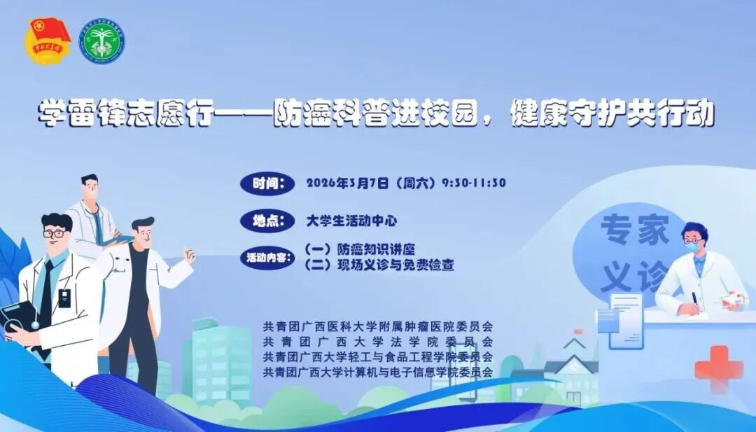 委员会,联合共青团广西医科大学附属肿瘤医院委员会,将于2026年3月7日开展“学雷锋 志愿行--防癌科普进校园,健康守护共行动”主题公益活动。